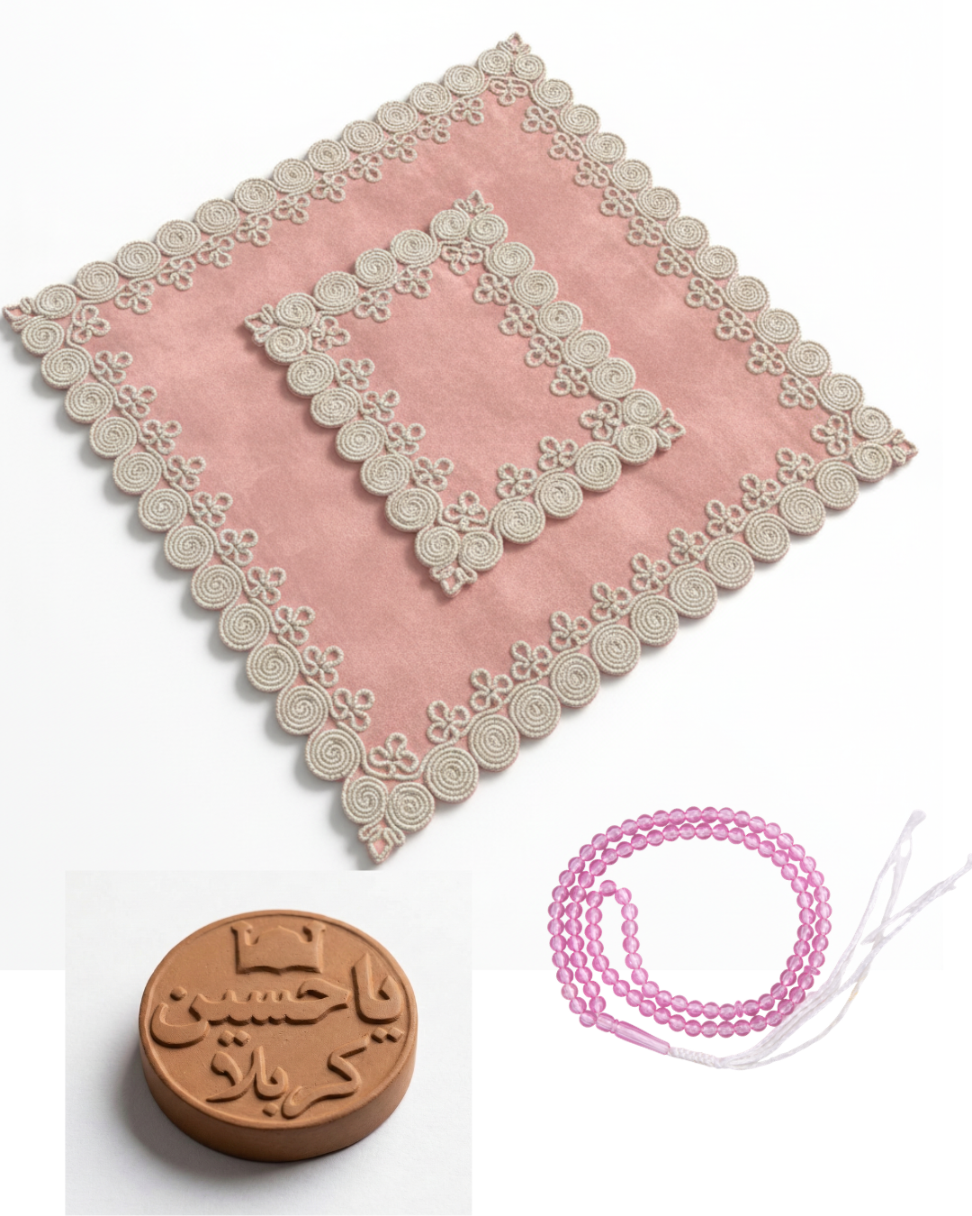 Zweiteiliger Gebetsunterleger + Klein Gebetsstein aus Karbala +Gebetskette - in 4 Farben